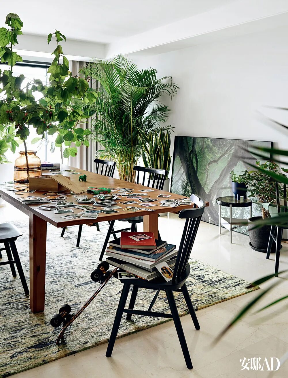 为长桌挑选椅子的时候,张悦就觉得怎么都不太对,在一次去洛杉矶拍摄的过程中,他恰好在一个空间里看到一张几乎和自家同色的桌子搭配了轮廓简单的黑色餐椅。于是,一些黑色线条也被引入了这个家,不经意间,将空间的气质向“中性”压了压。