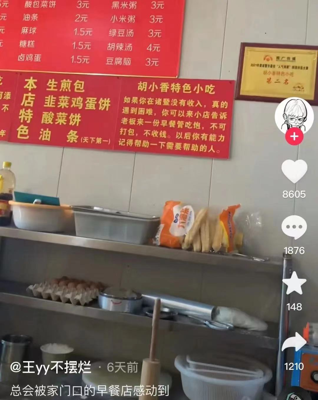 视频中,一张大红告示贴在墙上,上面写着:“如果你在诸暨没有收入,真的遇到困难,你可以来小店告诉老板来一份早餐管吃饱,不可打包,不收钱。以后你有能力记得帮助一下需要帮助的人。”