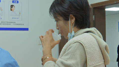 工作人员使用专用的雾化给药装置,将疫苗雾化至雾化杯中,并将雾化杯递给接种者,接种者只需要呼气,吸气,憋气,5秒钟就把疫苗接种完毕。
