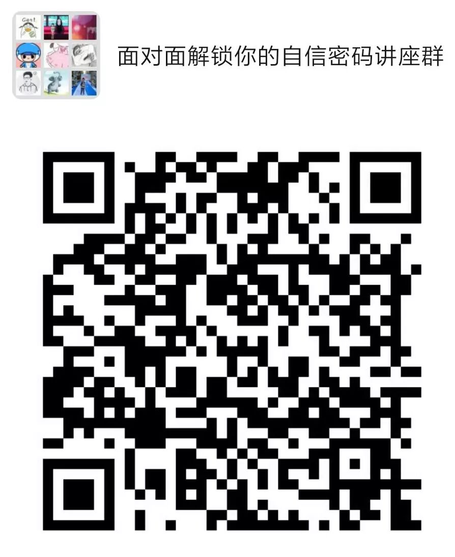 我们建了一个提升自信讲座群,特别邀请王亚南老师针对低自尊做一场免费讲座,如果你也有不自信、否定自己的情况,欢迎扫码进群。