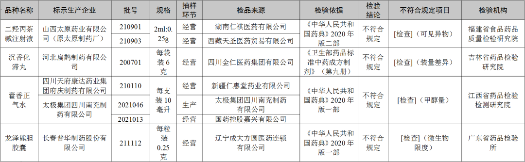 ● 经福建省食品药品质量检验研究院检验,标示为山西太原药业有限公司(原太原制药厂)生产的2批次二羟丙茶碱注射液不符合规定,不符合规定项目为可见异物。● 经吉林省药品检验研究院检验,标示为河北扁鹊制药有限公司生产的1批次沉香化滞丸不符合规定,不符合规定项目为装量差异。● 经江西省药品检验检测研究院检验,标示为四川天府康达药业集团府庆制药有限公司、太极集团四川南充制药有限公司生产的3批次藿香正气水不符合规定,不符合规定项目为甲醇量。● 经广东省药品检验所检验,标示为长春普华制药股份有限公司生产的1批次龙泽熊胆胶囊不符合规定,不符合规定项目为微生物限度。● 经中国食品药品检定研究院检验,标示为盐城市中药饮片有限公司生产的3批次菊花不符合规定,不符合规定项目为禁用农药残留量。● 经甘肃省药品检验研究院检验,标示为云南健安堂生物科技有限公司生产的1批次茜草不符合规定,不符合规定项目包括性状、鉴别;标示为桂林中南(亳州)药业科技有限公司生产的2批次茜草不符合规定,不符合规定项目包括性状、鉴别、总灰分、酸不溶性灰分、浸出物。● 经中国食品药品检定研究院检验,标示为桂林中南(亳州)药业科技有限公司生产的1批次紫草不符合规定,不符合规定项目为含量测定;标示为郑州瑞龙制药股份有限公司生产的6批次紫草不符合规定,不符合规定项目为性状。中央政治局会议建议:党的二十大10月16日在北京召开