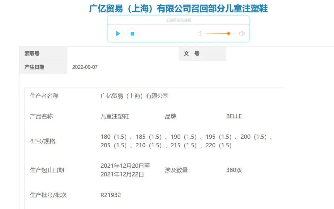 召回公告显示,广亿贸易(上海)有限公司召回2021年12月20日至2021年12月22日期间生产的型号为180(1.5)、185(1.5)、190(1.5)、195(1.5)、200(1.5)、205(1.5)、210(1.5)、215(1.5)、220(1.5),批号为R21932的“BELLE”儿童注塑鞋,涉及360双。