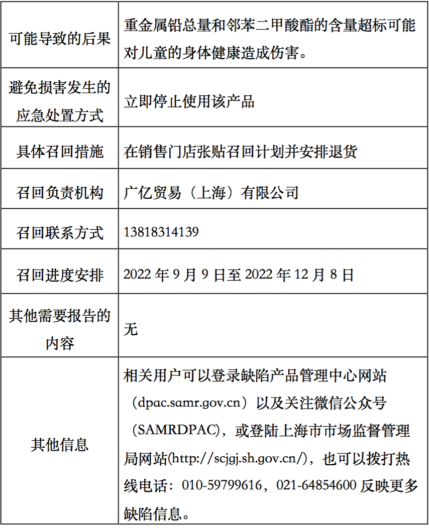 近日,上海市市场监管局发布信息称,因重金属铅总量和邻苯二甲酸酯的含量不符合GB30585-2014《儿童鞋安全技术规范》标准要求,广亿贸易(上海)有限公司召回360双