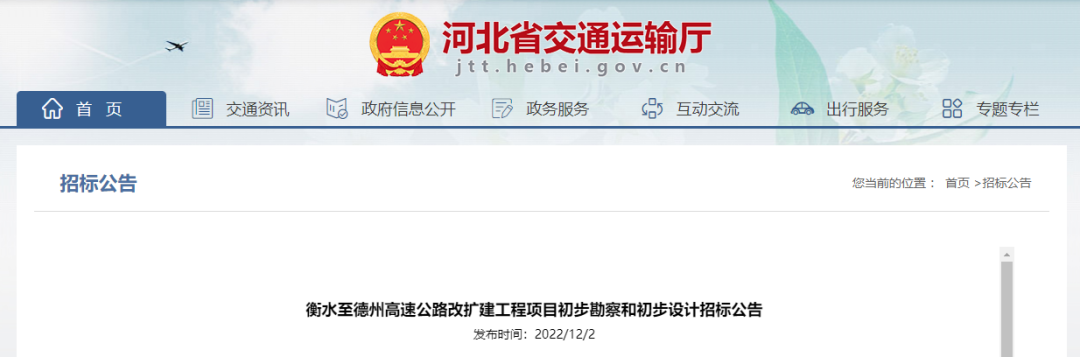 12月2日,河北省交通运输厅发布衡水至德州高速公路改扩建工程项目初步勘察和初步设计招标公告。改扩建标准为双向六车道,主线设计速度120公里/小时。