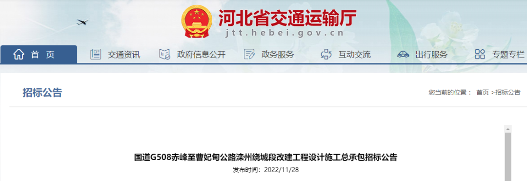 11月28日,河北省交通运输厅发布国道G508赤峰至曹妃甸公路滦州绕城段改建工程设计施工总承包招标公告。全线采用双向四车道一级公路标准,设计速度80公里/小时。