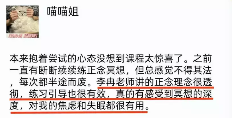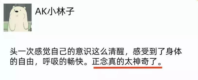 有正在经历工作、生活无奈变动的职场人,用正念去提升稳定自我内核、对抗负面情绪的能力;也有来自清华北大的高校学生,用正念去缓解繁重学业压力,让大脑持续清醒,保持好状态;也有总控制不住自己熬夜的伙伴,将正念作为每晚睡前仪式,不再失眠,给自己一个能量满满的早晨☀️