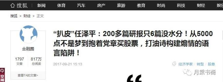 9月21日,搜狐转载一篇名为《“扒皮”任泽平:200多篇研报只6篇没水分!从5000点不是梦到抱着党章买股票,打油诗构建煽情的语言陷阱!》的有强烈语言色彩的文章。