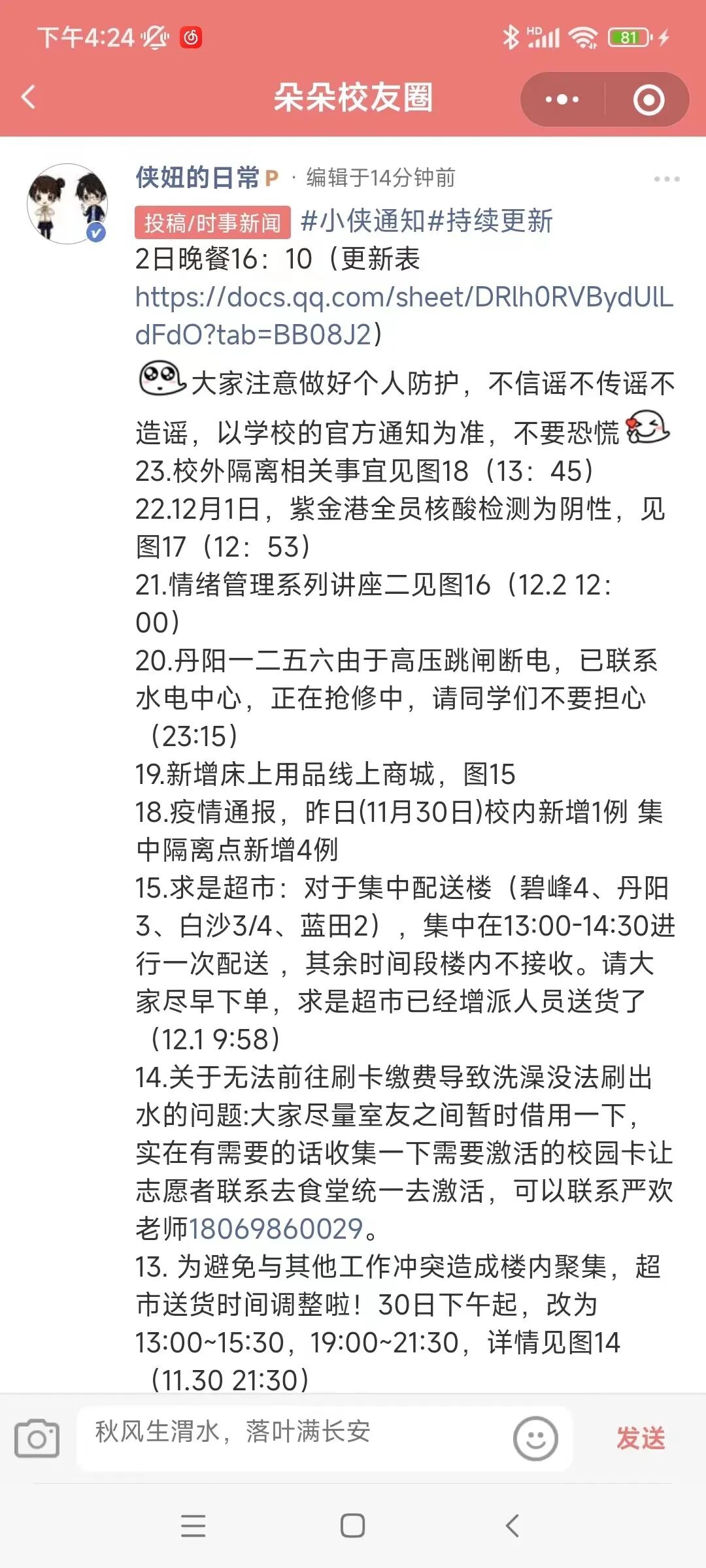 学生会还临时组建了疫情防控机动工作组,服务和响应同学们的各项需求。借助“侠妞的日常”账号在朵朵校友圈、CC98等平台收集同学们的问题并进行反馈,第一时间为滞留同学在钉钉上建立信息群,传达学校疫情防控最新政策和实用生活信息。学生会的工作人员和志愿者在线上轮流值班,运营各平台账号,及时更新最新的相关动态,同时倡议同学们在做好自身防护的基础上参与力所能及志愿服务工作。