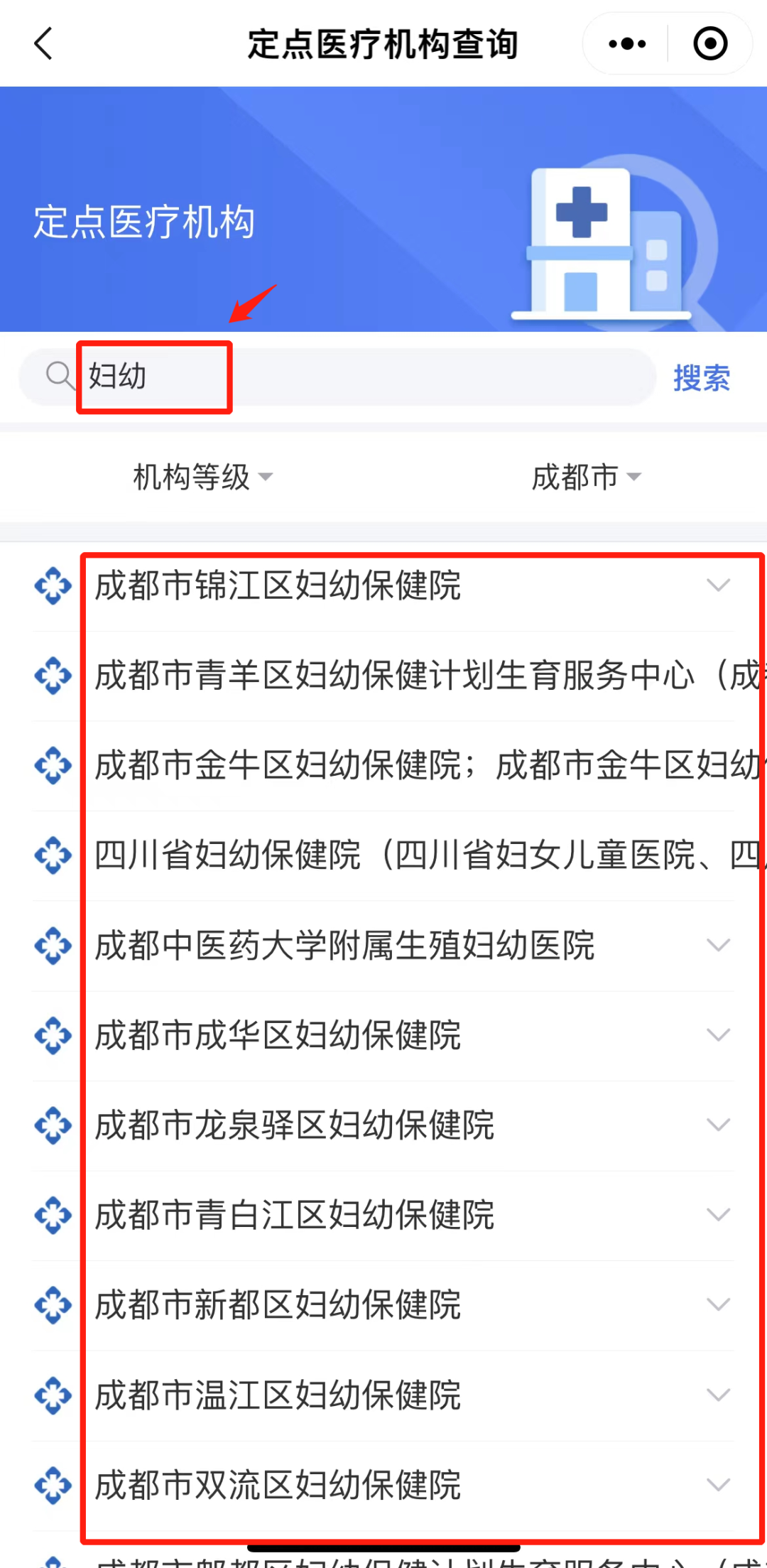 大家也可以进入“四川医保服务平台”,点击【服务】板块中的【定点医疗机构查询】,在搜索框输入“妇幼”或者“儿童”就可以查询到成都妇幼医院地址、联系方式等信息啦~