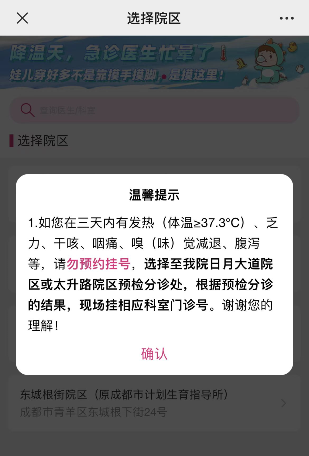 温馨提示:目前部分医院对于有发热、乏力、咽痛等症状的患者实行预检分诊,不接受网上挂号,要现场预检之后才能挂相应科室门诊号(如成都市妇女儿童中心医院、成华区妇幼保健院等),大家在网上预约时候要注意查看相关公告。