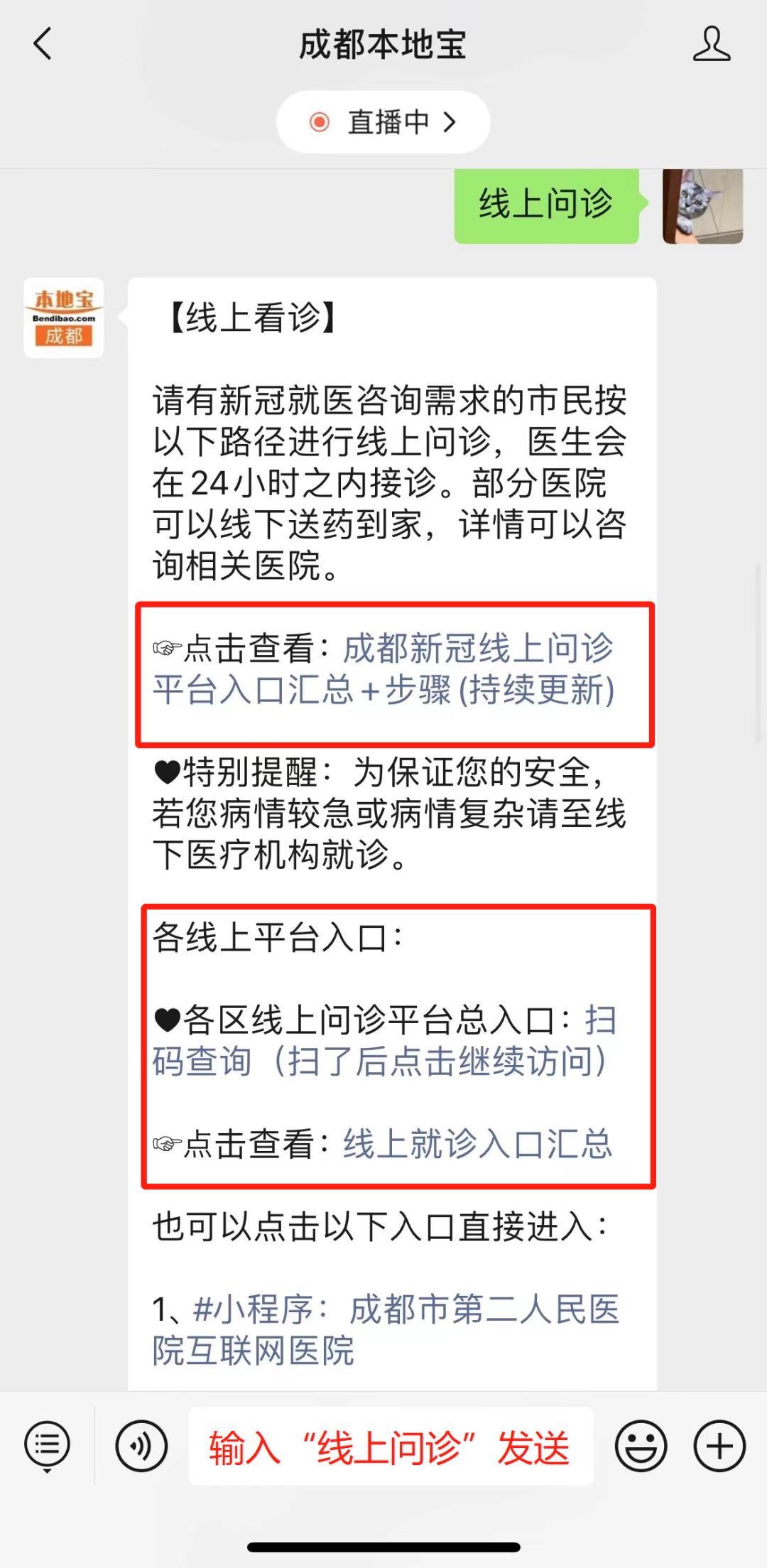 👉推荐服务:点击下方链接关注【成都本地宝】公众号,在对话框发送【线上问诊】获取成都线上问诊入口、就医指南等。