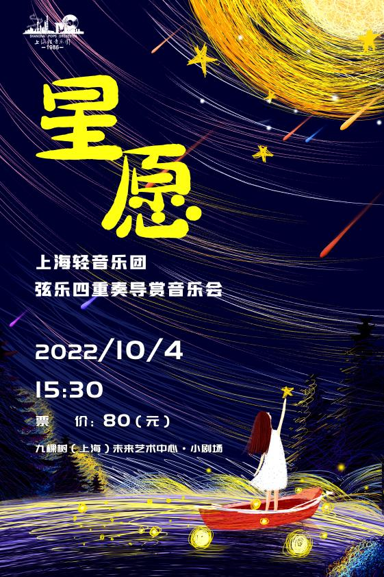 The Starry Wish, presented by Shanghai Pops Orchestra String Quartet, selects gentle and elegant classical music, including the charming Waltz Of The Flowers by Tchaikovsky, the graceful and outstanding Pavane for a Dead Princess by Ravel, and the vivid and lively Golliwog's Cakewalk by Debussy. Music of various styles will make it a perfect concert.