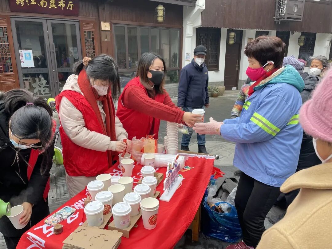 1月1日清晨,冒着凛冽寒风,庄行镇“红帽子”志愿者来到街头,为奋战在一线的户外职工送上姜茶。在这特殊时期,环卫工人、外卖小哥、网格员、巡逻民警……无数的人依然在街头巷尾,守护着这座城市的有序运营。一杯杯姜茶,甜中带辣,饱含着志愿者对他们的深深祝福。