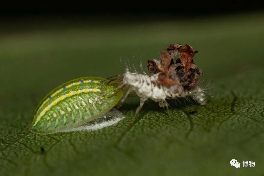一只背着垃圾伪装自己的蚜狮正准备享用刺蛾幼虫