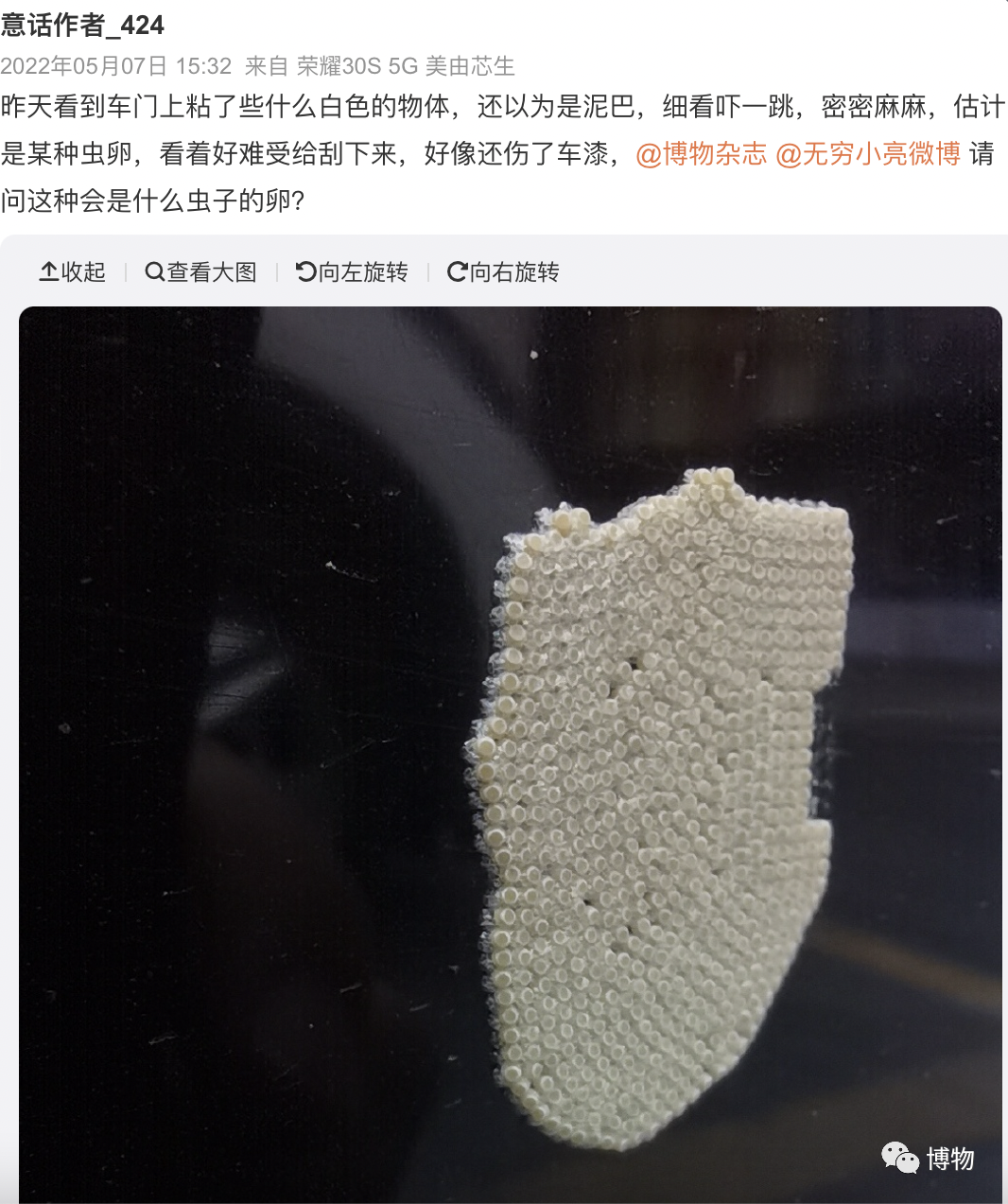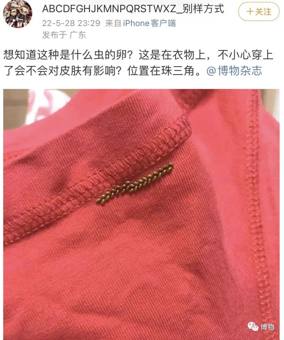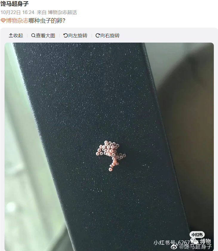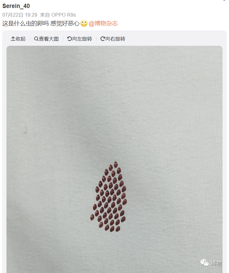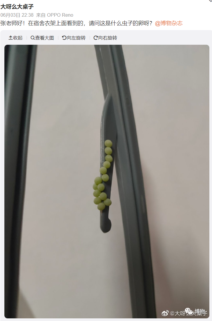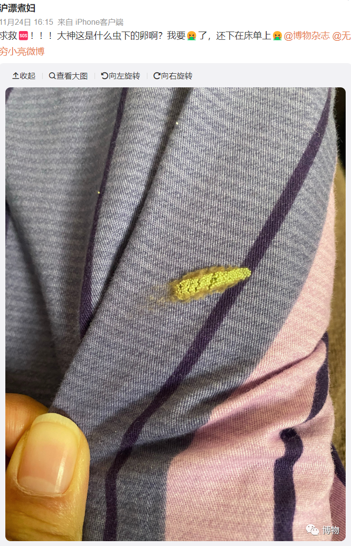 是的,晾在外面的衣服上出现虫卵,对许多朋友来说或许都不是什么陌生的事情。除了衣服上,这些卵也可以在家里的窗户上、门框上、墙上等地方随机出现。每年在后台询问我们这些虫卵的,都能汇总出满满一个文件夹。