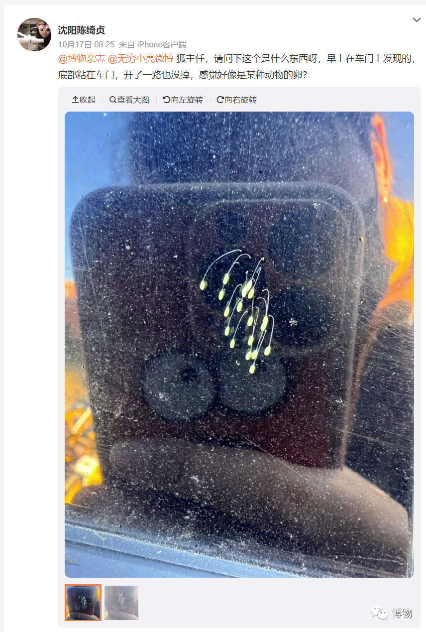 还有一种很好认的卵,是下边拉着丝的白色或淡绿色椭球体,常凭空出现在各种物体表面,看起来有点像是菌类或植物的种子,在营销号嘴更是常被说成三千年一开花的优昙婆罗花,此生难得一遇。