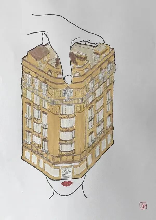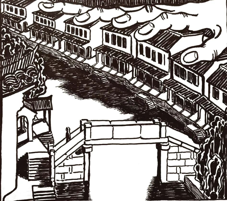 这让我想起有一个像他一样用理工男脑子画画的荷兰版画家安舍尔,他所构建的世界充满着悖论,作品里的建筑永远不可能在现实中复制出来,只存在于他的画面,只存在于脑海的世界。金宇澄则常用手的意象驾驭画面,大手可以抓取上海作协阳台上奔跑的马群,抓住瑞金路口的S公寓,托起静安寺……大手仿佛借助了命运,直接左右画面的焦点。