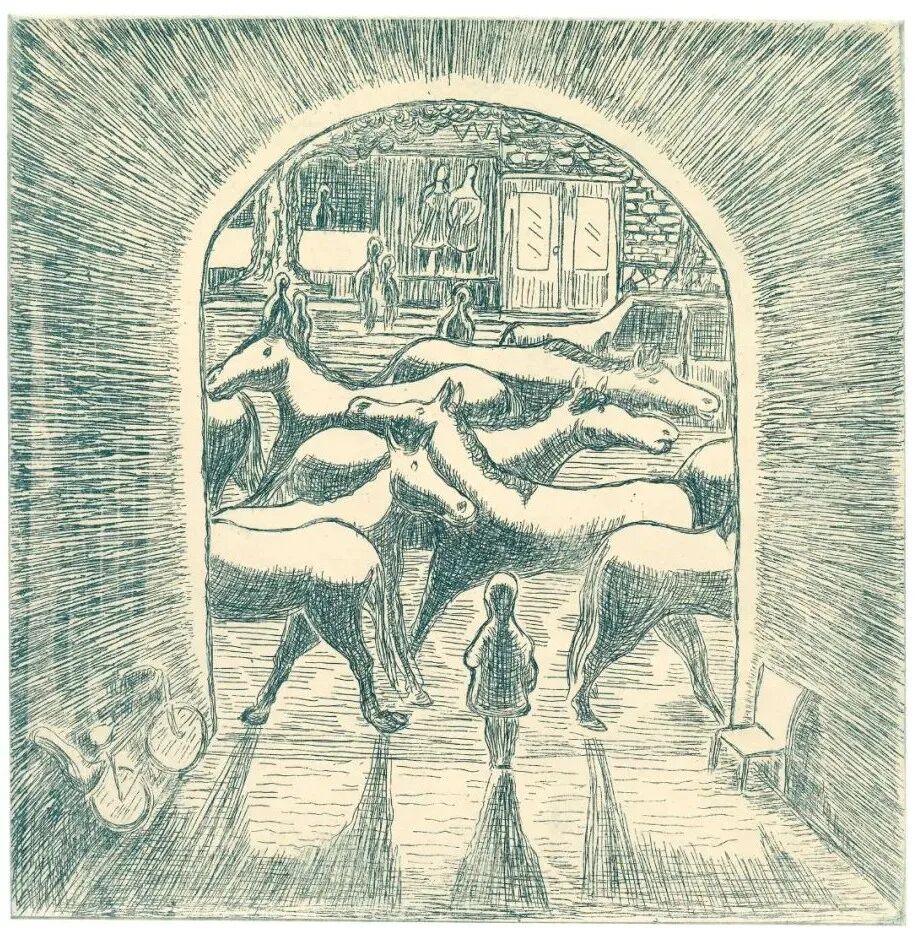 对金宇澄作品的视觉不真实,我们还需要疑惑吗?马,明明没有翅膀,可人类在图像中非要给马安上一对翅膀,叫做飞马。这是人类嫌自己的时间空间不够,在另一个平行世界给硬加上的。金宇澄深深感到文字世界达不到之处,图像可以达到,图像世界达不到之处,文字可以达到,文字与图像互为表里,这是老金的一对翅膀,也是老金玩弄的一个“克莱因瓶”,终点就是起点,里面就是外面的悖论游戏。