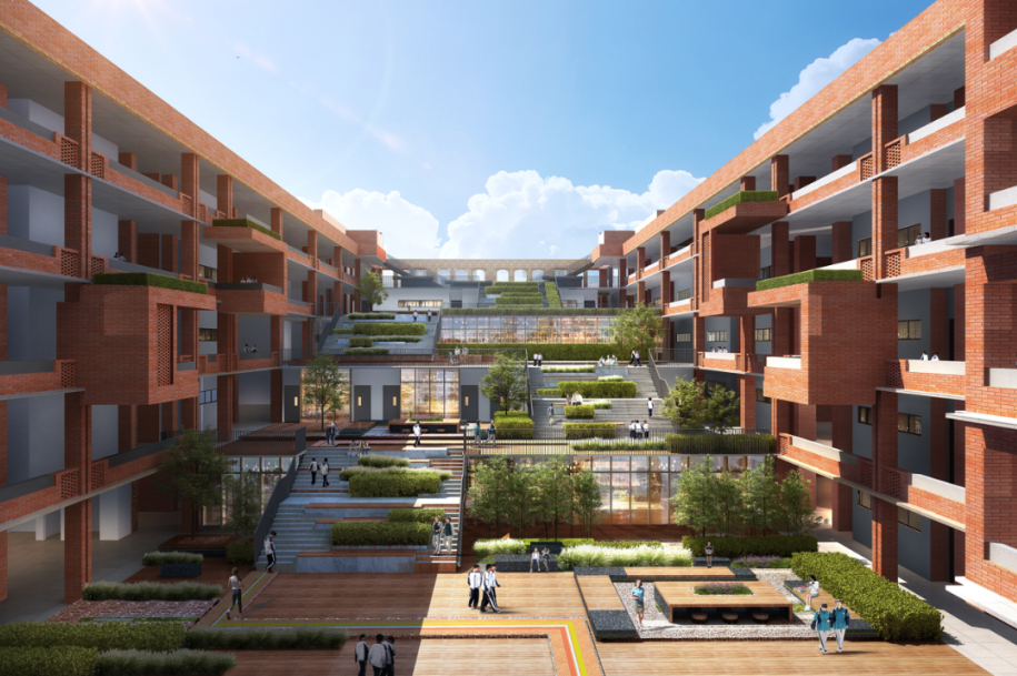 教学楼地下2层、地上6层,设有图书馆、普通教室、实验室、教师办公室等,属四栋合围式建筑,内设中庭。中庭主要建筑为校图书馆和学生活动室,俨然是一个充满书香味的多维度、多层次的立体花园。教学楼一左一右设空中阶梯,拾阶而上,可看到一道特别的风景线,整体营建宜学习、宜放松的绿色花园式生态校园。