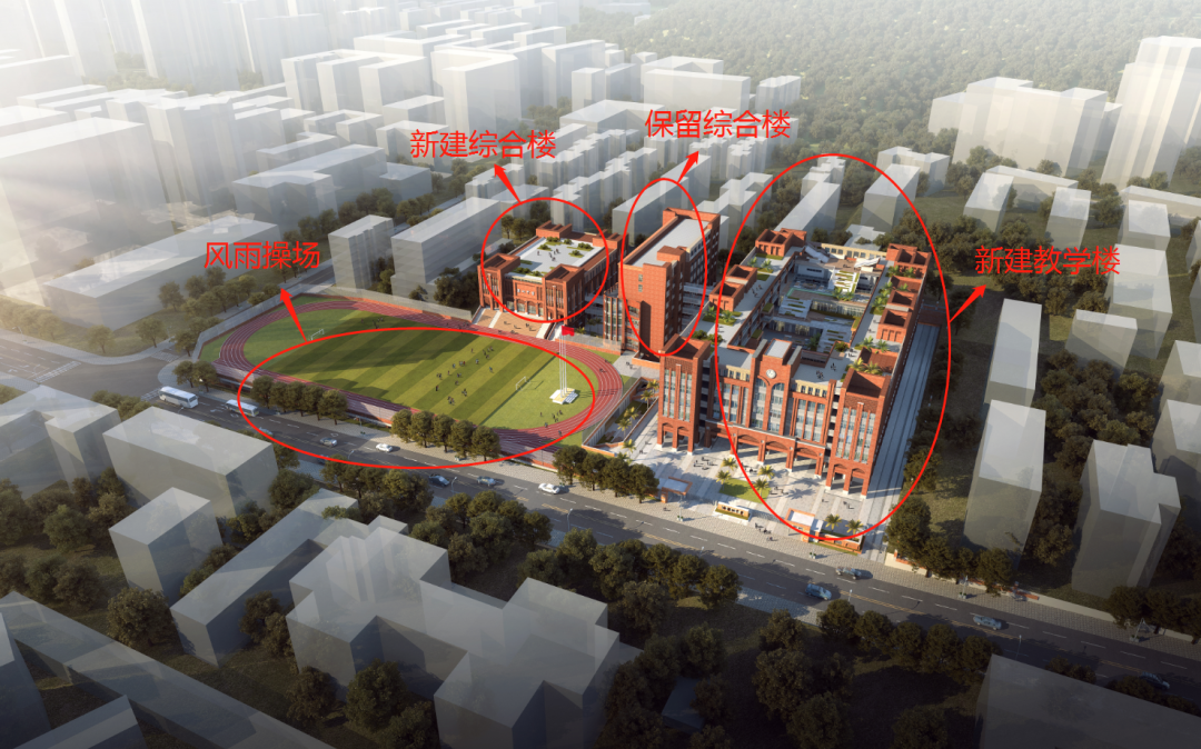 深圳中学初中部位于罗湖区翠竹街道贝丽南路与田贝三路交汇处,改、扩建工程完成后,校园建筑面积将达6万余平方米,包含新建教学楼、保留综合楼、新建综合楼(报告厅与餐厅)、风雨操场共计四个建筑群。