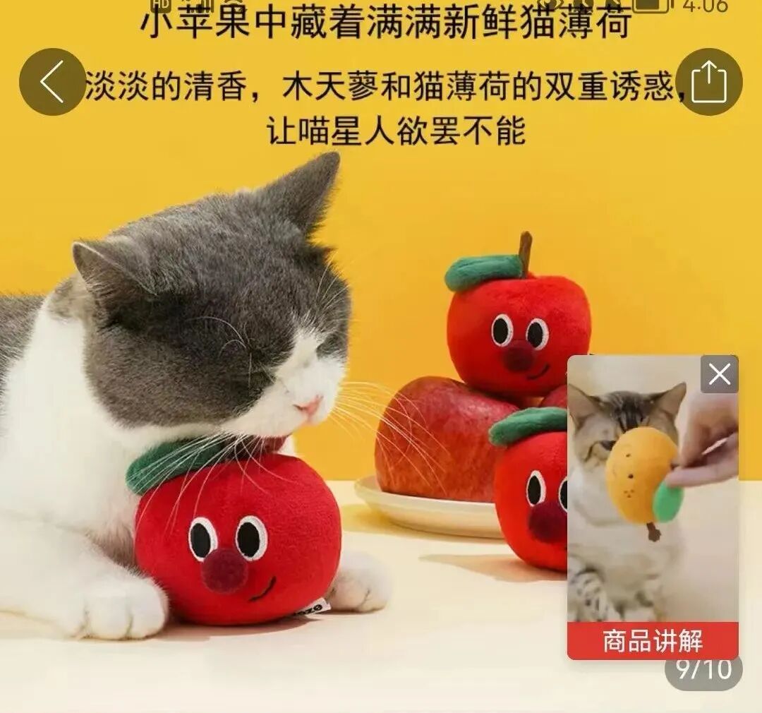 据仇攀逸介绍,店铺有一个王牌产品叫做苹果木天蓼,玩具的外形是一个长着圆鼻头大眼睛的红苹果,像卡通片里走出来的一样,十分可爱。另外,小小的苹果中还暗藏玄机——苹果柄是由木天蓼制成的,整个苹果带着新鲜的猫薄荷味,十分耐咬。“我通过搜集资料、发现木天蓼嫩枝富含猕猴桃碱、B-苯乙醇,有助于调理猫咪的肠胃健康,舒缓猫咪的情绪,同时又很耐咬,能给猫咪磨牙。而其外形又正好与苹果柄相似,于是提出了用木天蓼作为制作苹果柄的原材料的小建议,没想到这一小小的改进却带来了产品销售量的剧增,苹果木天蓼的月销售量从原本的1000猛增到了2000+。”