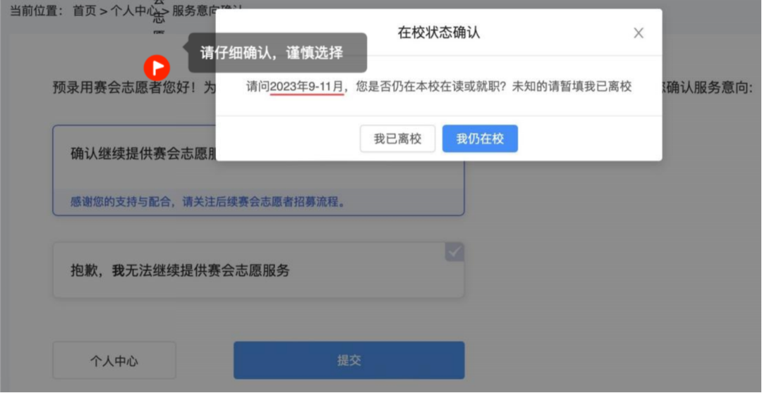原预录用赛会志愿者须于2022年12月10日前通过“赛会志愿者招募系统”进行服务意向确认,逾期未确认视作放弃亚运赛会志愿服务资格。