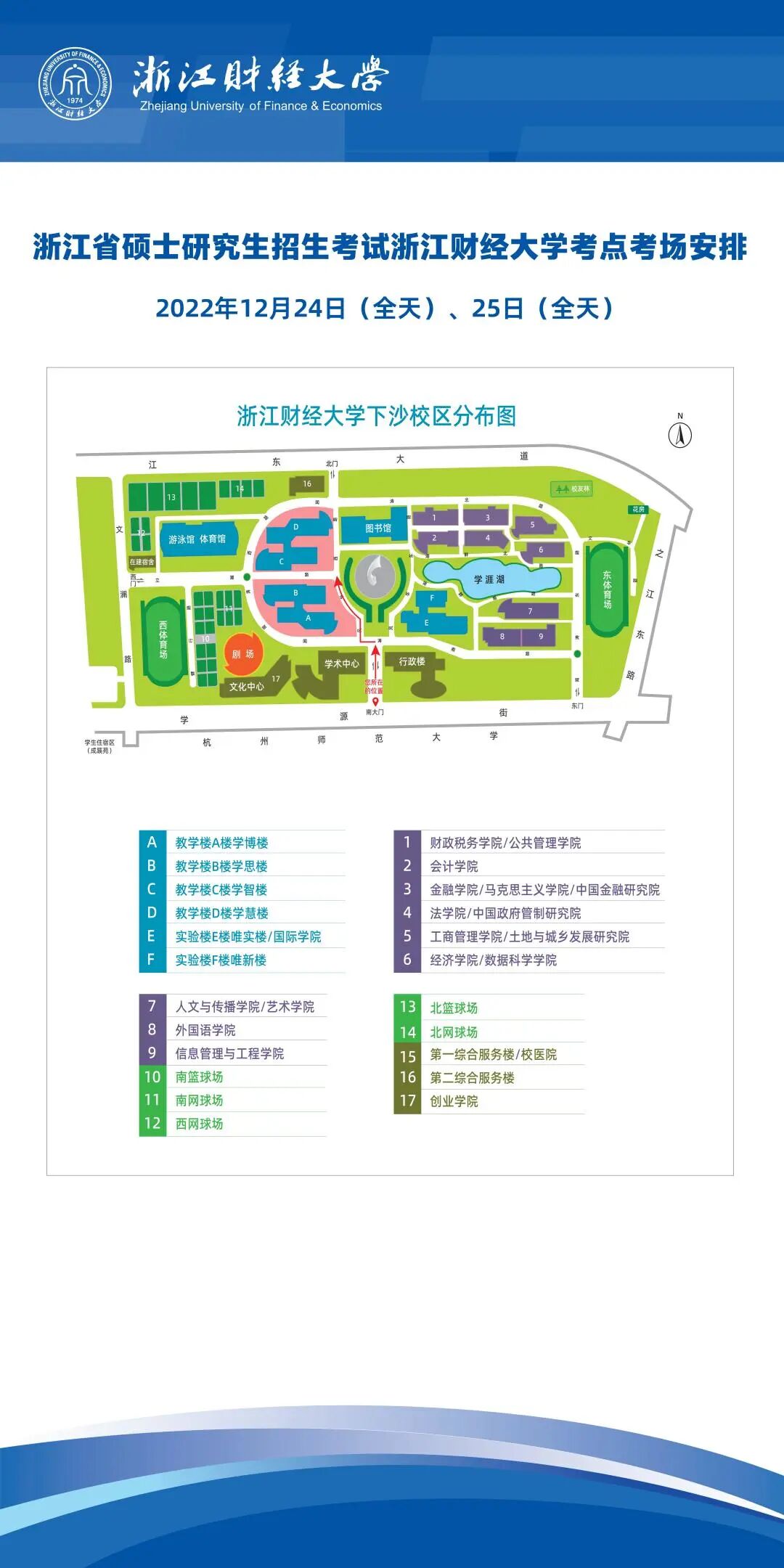 考场安排在浙江财经大学下沙校区A、B、C、D教学楼,考场距离学校南大门步行5分钟左右。受疫情影响,建议考生提前一小时到达考点,预留充分的进场时间,以免因迟到而无法入场。因学校疫情防控要求,我校考点不安排提前一天现场查看考场。我校考点考场分布图如下: