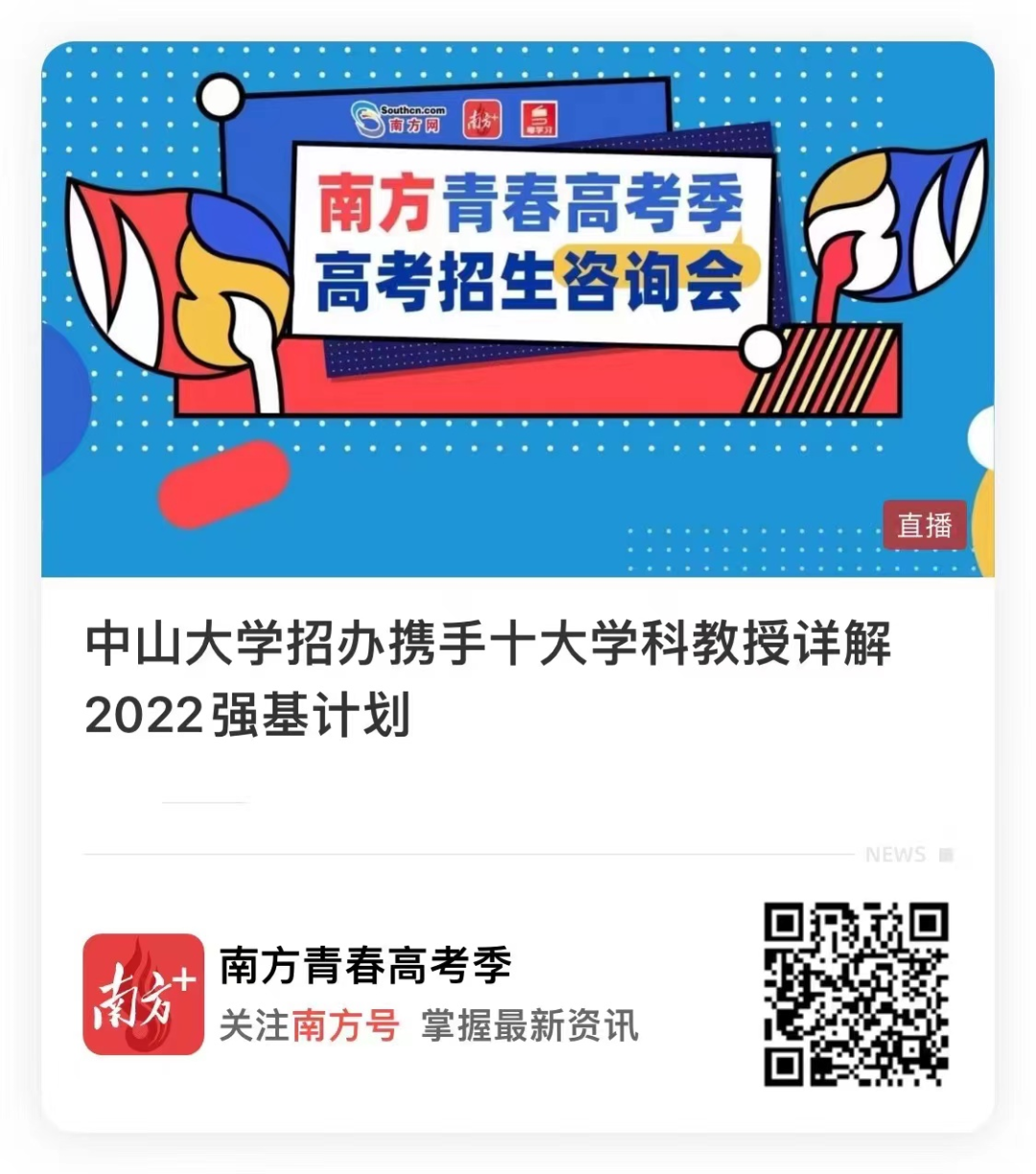 2022年4月11日(周一)晚上19:00,由南方新闻网主办的“南方青春高考季-高考招生咨询会”活动,邀请中山大学招生办公室主任荐志强携十大学科教授做客南方报业传媒集团演播室,为全国考生详解强基计划!届时,中大招生视频号、南方+客户端、“粤学习”客户端三个平台同步播出,敬请关注!