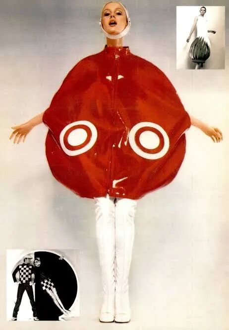 三就是结构、剪裁与线条的使用。这一点在未来主义三杰的设计之中体现得非常明显,几何廓形的大量运用,夸张的造型特点,迷你喇叭裙、钟形帽、撞色拼接下的条纹修饰,一股浓郁的早期科幻电影既视感油然而生。