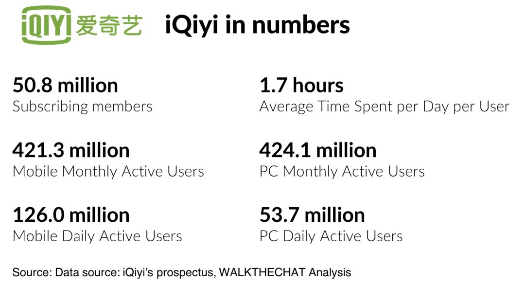The IPO prospectus shows that as of December 31, 2017, iQiyi had around 421.3 million average mobile MAUs (Monthly Active Users) and around 126.0 million average mobile DAU (Daily Active Users).
