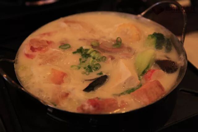 太妃锅可以说是非常健康养生了。主要食材有海鲜、鱼板烧、贡丸、猪肉片、玉米、豆腐、白菜、粉丝等。因此,勾出来的汤汁又鲜又甜。整个锅的精髓都在汤底,不仅奶香味十足,而且尤其能尝出白菜等蔬菜的鲜味,味道和上汤娃娃菜有几分相似。