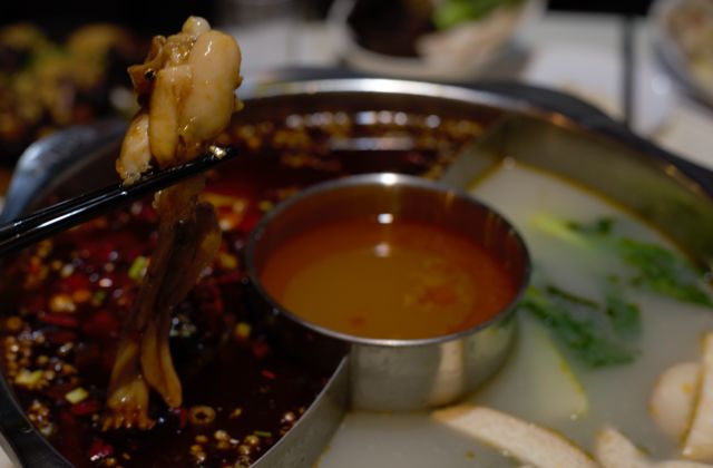喜欢吃凤爪的一定不要错过这道菜了,看似平淡无奇的一道泡椒凤爪其实也是特有讲究,老板介绍,不同于有些餐厅保留整只鸡爪的处理方式,巴适成都采用最正宗的切法给鸡爪分段,使凤爪吃起来更饱满有弹性。特别是恰到好处的酸辣味,在麻辣锅的间隙吃一个个凉凉的凤爪也是别有滋味。