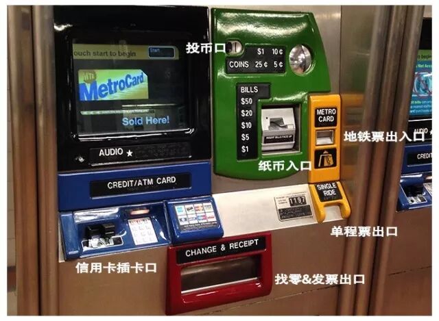 纽约的地铁里有两种售票机。一种只收卡,另外一种收卡和现金。纽约现在的地铁售票机有中文系统了,确实方便了不少呢~