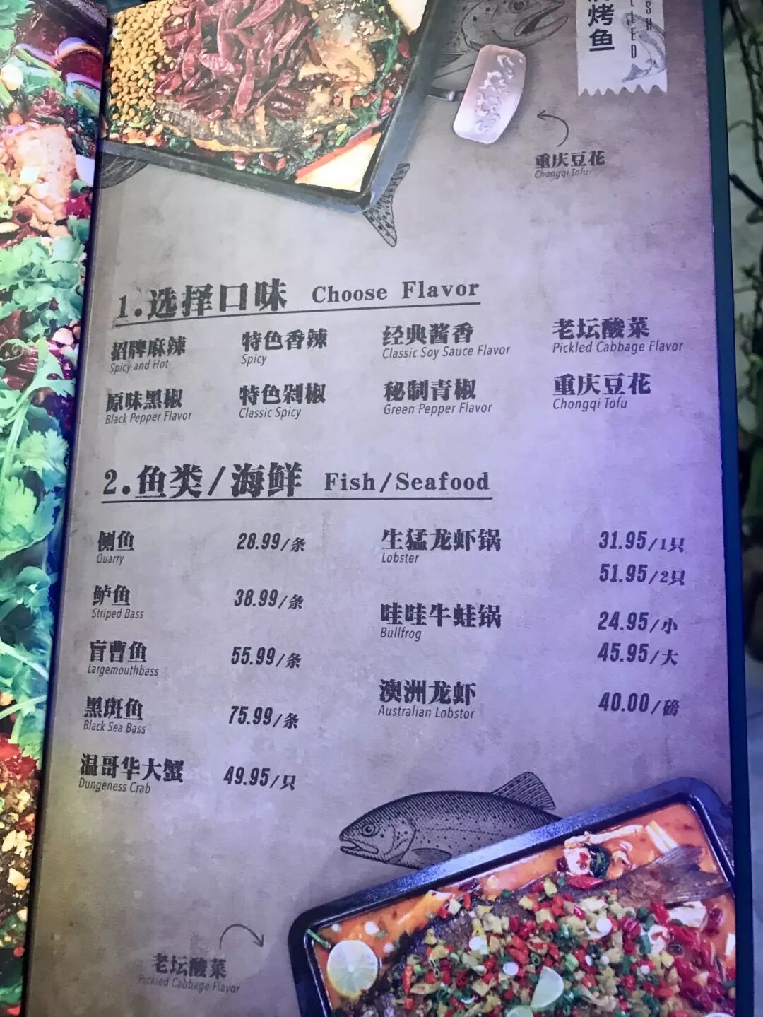 今天我们吃了店内推荐的特色剁椒烤鱼~毕竟店门上贴着的硕大的海报上,推荐的第一个就是烤鱼。烤鱼不仅可以自己选择鱼类,还可以选择配菜,本次小编鱼类选择了肉质扎实的侧鱼,辅菜搭配了最爱的魔芋丝、豆腐皮、腐竹和海带结。店内还有鲈鱼,盲曹,黑斑鱼可以选择~