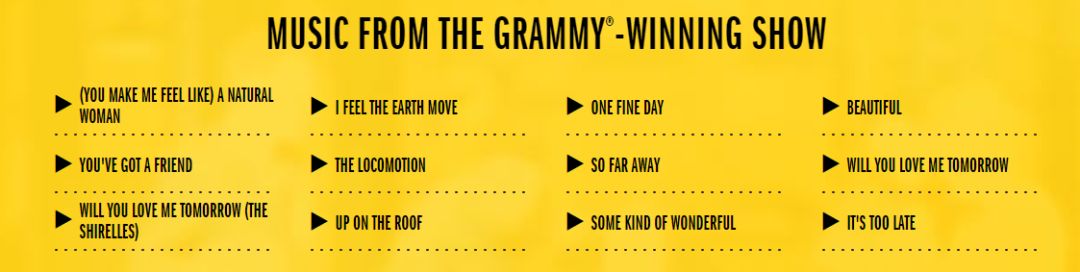这个音乐剧讲述了由Abby Mueller扮演的美国作曲家Carole King的传记故事。她一生创作了无数脍炙人口的歌曲,以下这12首也都被巧妙地穿插在了这出音乐剧里。