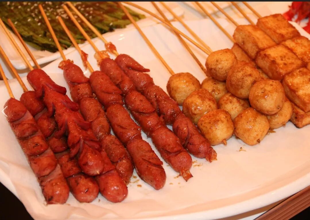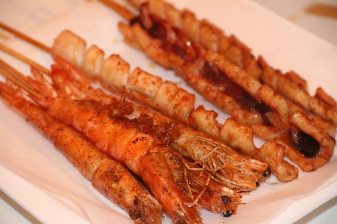 除了肉串之外,其他串的种类也是层出不穷!比如亲亲肠,鱼丸,虾,鱿鱼等等, 必不能少的还有韭菜和金针菇!