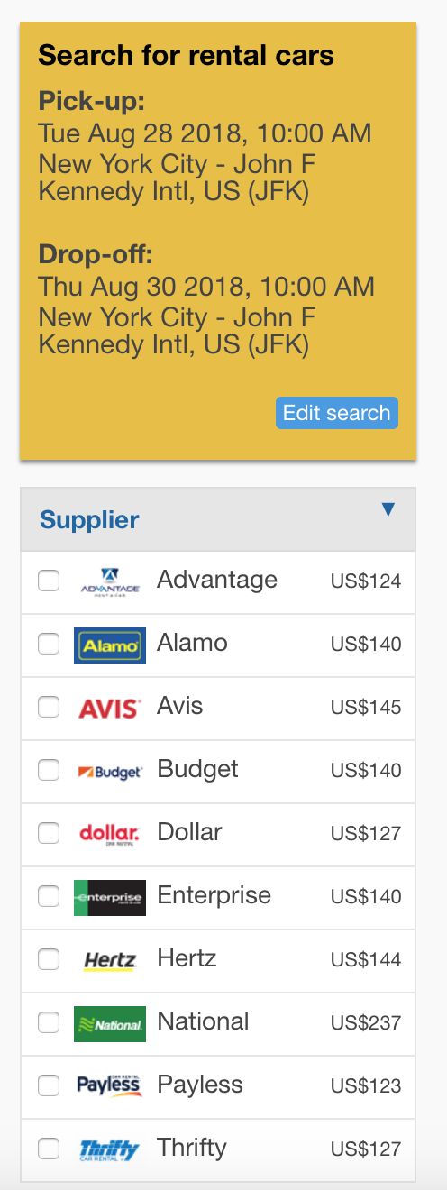 比如,搜索JFK机场,就可以看到不同公司的价格: