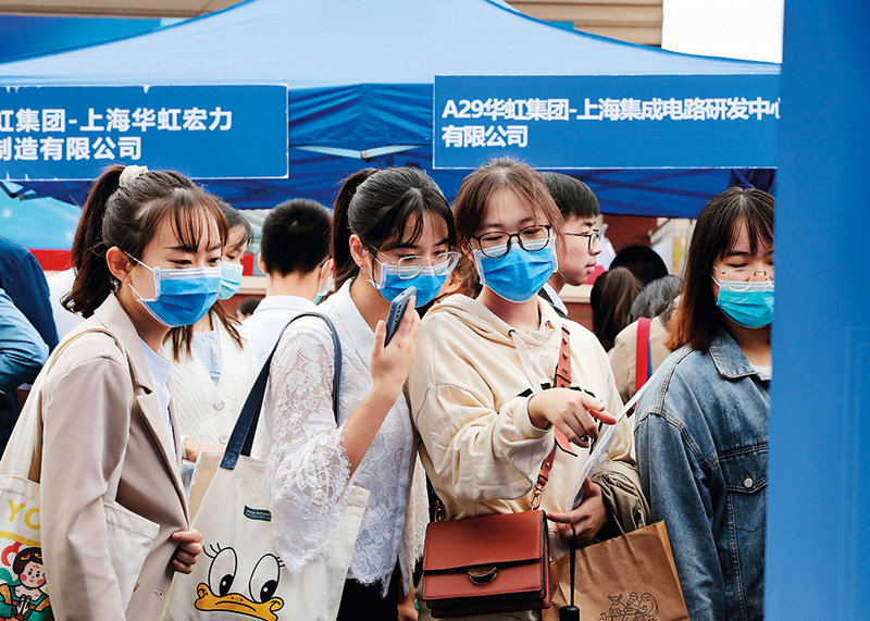毕业生在2022届上海高校毕业生秋季校园招聘会上了解岗位信息 (图源:《瞭望》)
