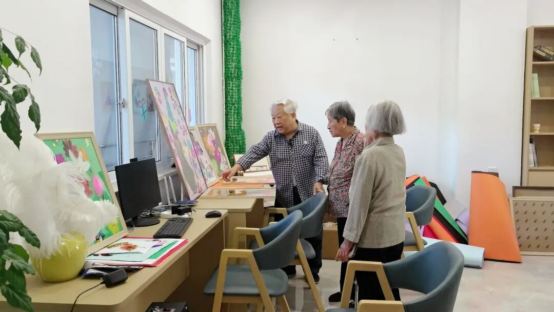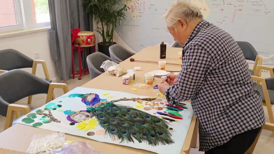 上午九点,今年已经84岁的郭秉强来到县养老中心的阅览室,细心地制作起了手工画《孔雀》。他告诉我们,自己是县文化馆的退休干部,今年年初从家里搬到养老中心来生活,相比在家里,在这里可以找回自己曾经的兴趣爱好,也更能找到志趣相投的朋友。