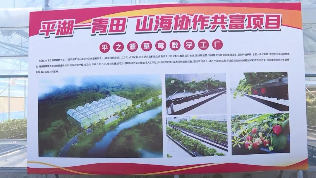 东源口村草莓数字工厂是平湖市和青田县农业产业抱团共富合作项目,建造占地约2亩高标准温室大棚,总投资109万元,使用无土栽培技术,利用先进智能化设施设备自动控温自动补充养料,通过立体种养打破了我县传统草莓种植模式。该项目由浙江大印农业科技有限公司提供项目设计、运营、种植技术等全方位服务,东源口村家庭农场负责日常管理。