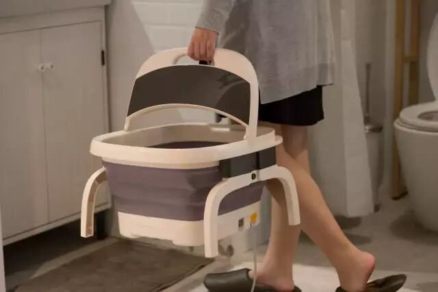 打开两边支架,立在地上,往中间按压折叠部分,足浴盆就撑开了。