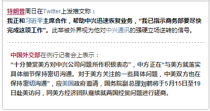 事过不久,特朗普发推文承诺帮助中兴通讯恢复业务。这与他挂在口头的”美国优先”政策相违背。