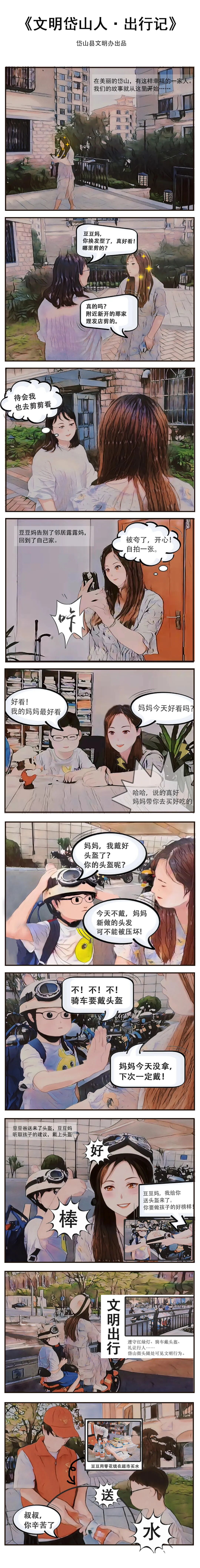 故事讲述了爱美的豆豆妈骑车出行,为了不压坏自己的新发型选择不戴头盔。在孩子豆豆的多次劝导下,最终认识到自己的错误,戴上头盔,文明出行。
