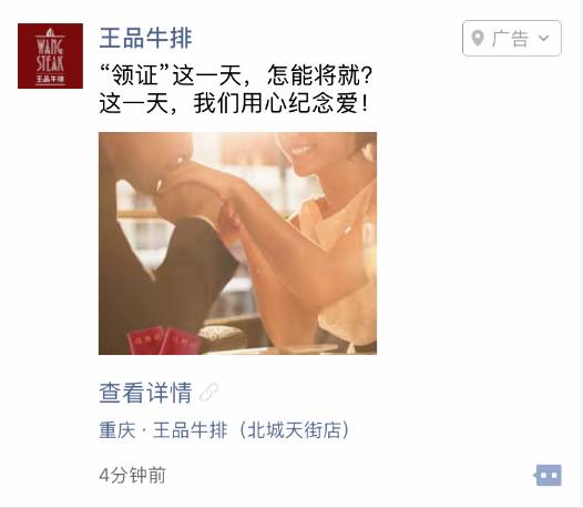 考虑到爱情、婚姻的话题具较强的社交传播属性,年轻人都乐于分享和点赞,王品选择了具有强大社交属性的微信朋友圈本地推广平台作为线上推广渠道,利用该平台可精准锁定商圈、地标的LBS功能和标签功能,王品在朋友圈进行了一次定向推广: