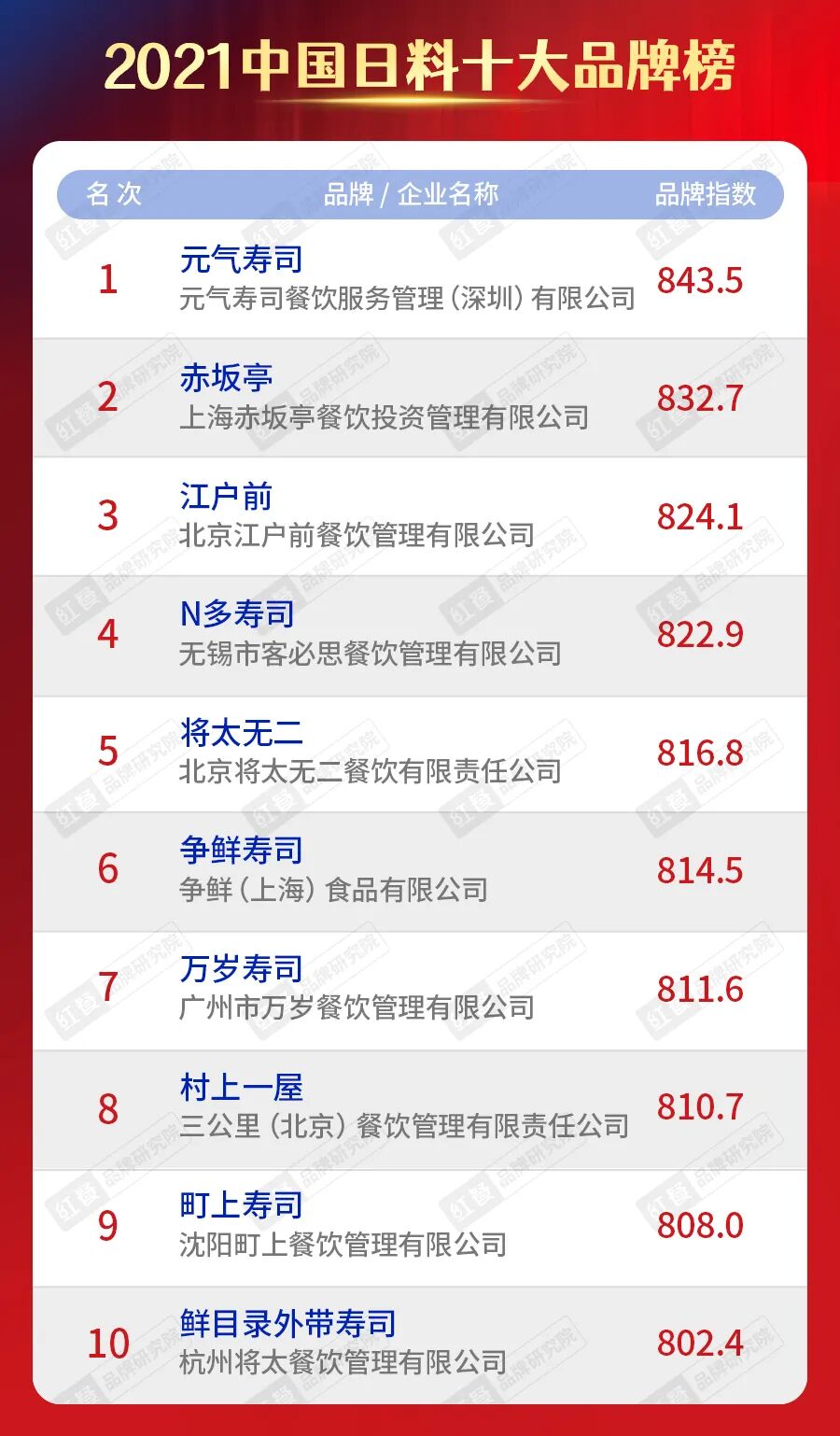 在“2021中国日料十大品牌”榜单中,元气寿司、赤坂亭、江户前、N多寿司、将太无二、争鲜寿司、万岁寿司、村上一屋、町上寿司、鲜目录外卖寿司登上榜单。