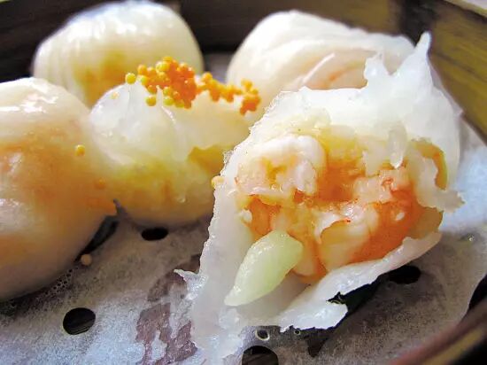 饮茶,少不了来一笼虾饺。上乘的虾饺,皮白如雪,薄如纸,半透明,肉馅隐约可见,吃起来爽滑清鲜,美味诱人。