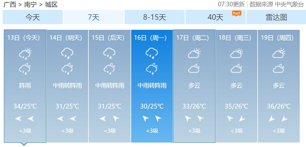 南宁市:多云转阵雨,偏东风1~2级,最低气温26℃,最高气温34℃