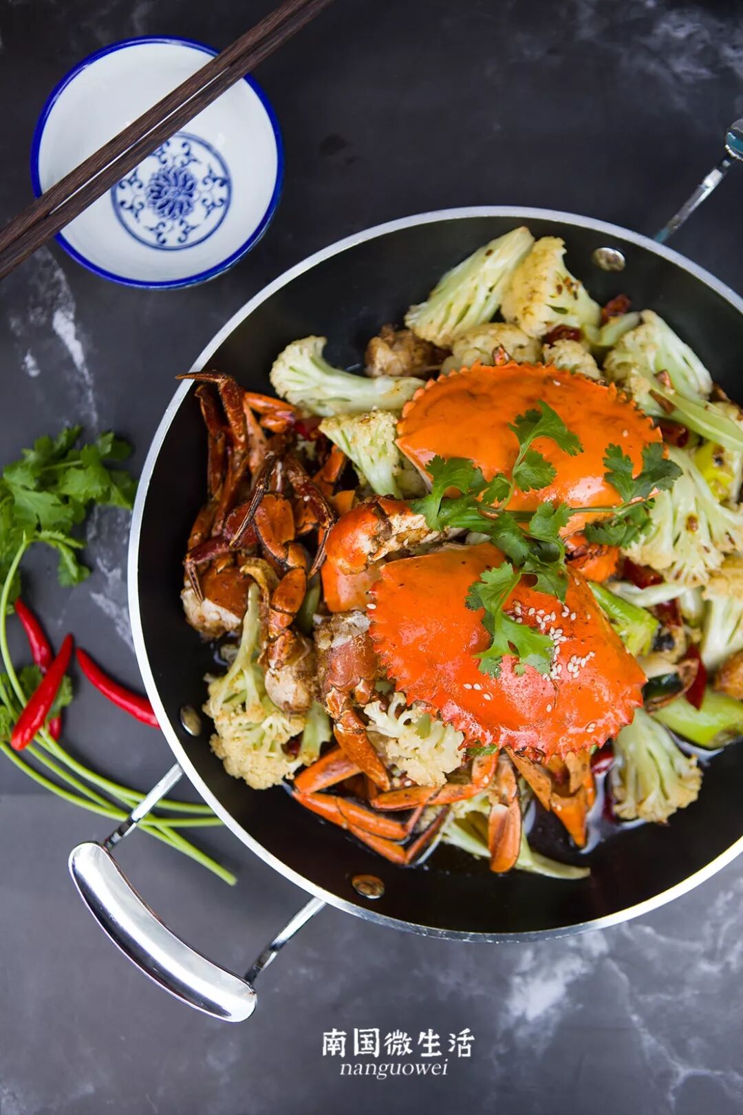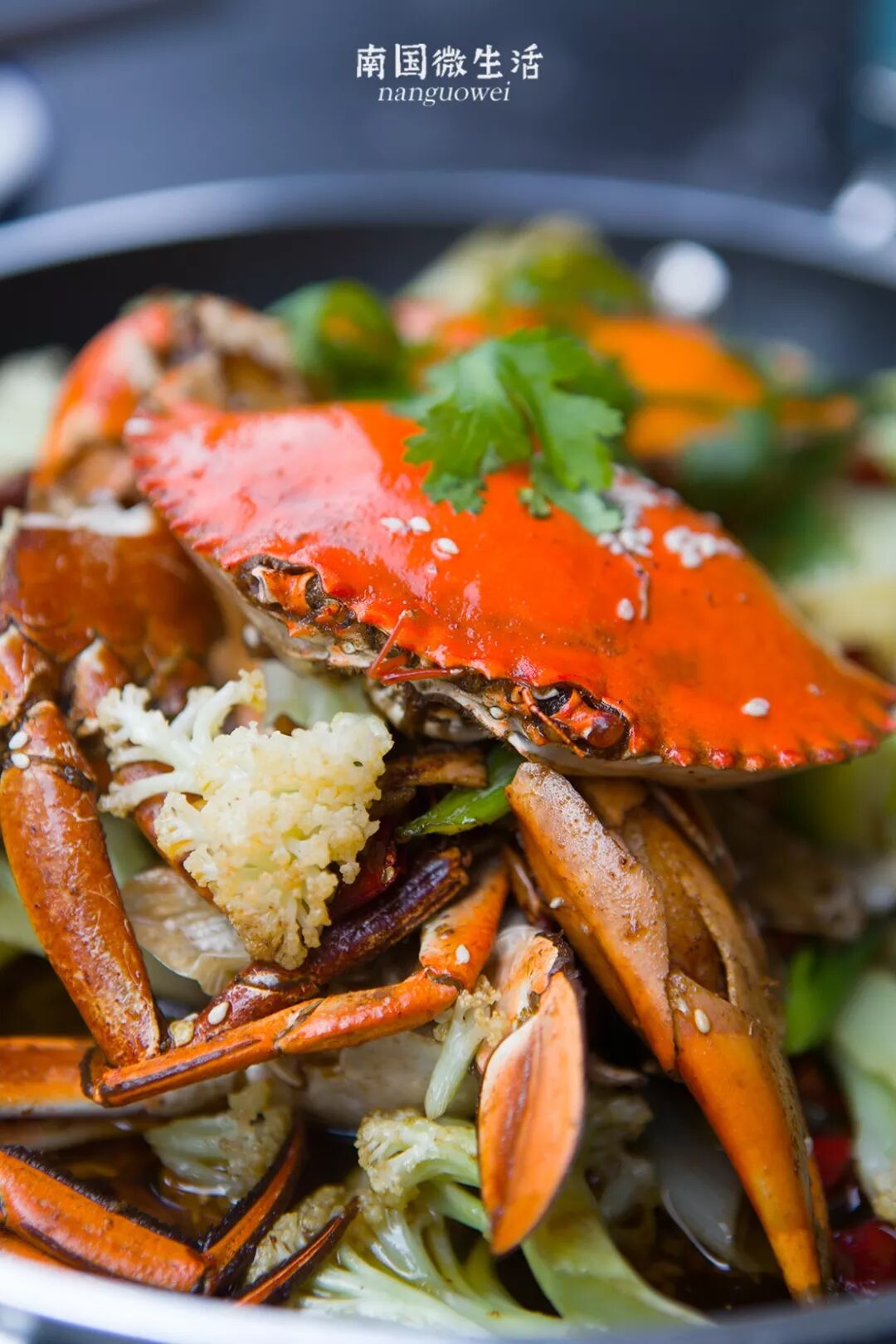 锅内放油,把姜、蒜米炒香,油温烧至100度左右,放入10克豆豉、20克尖红泡椒、5克自制蟹粉炒香后放入蟹壳、蟹钳、稍炒片刻放入蟹肉翻炒。
