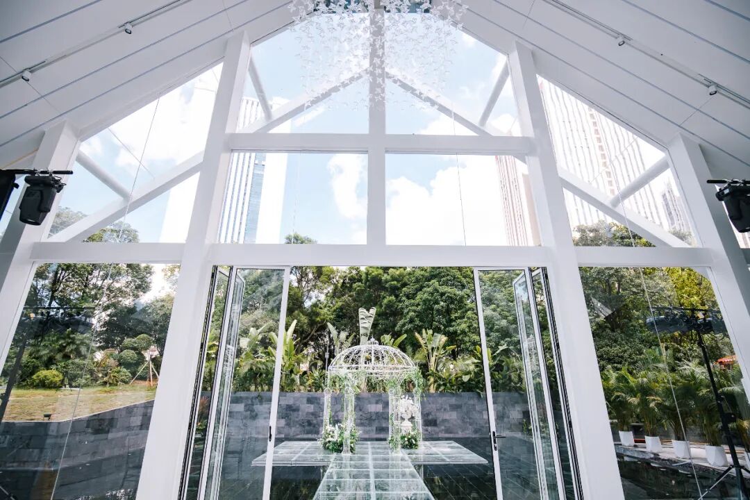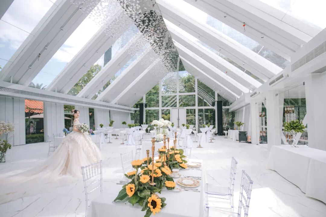 四周宽敞的玻璃墙幕设计,优雅的设计配以华丽的水晶吊灯,明亮宽敞,享有柔和的自然光线尽显大气,半户外的精致小花园,让婚礼更具仪式感。