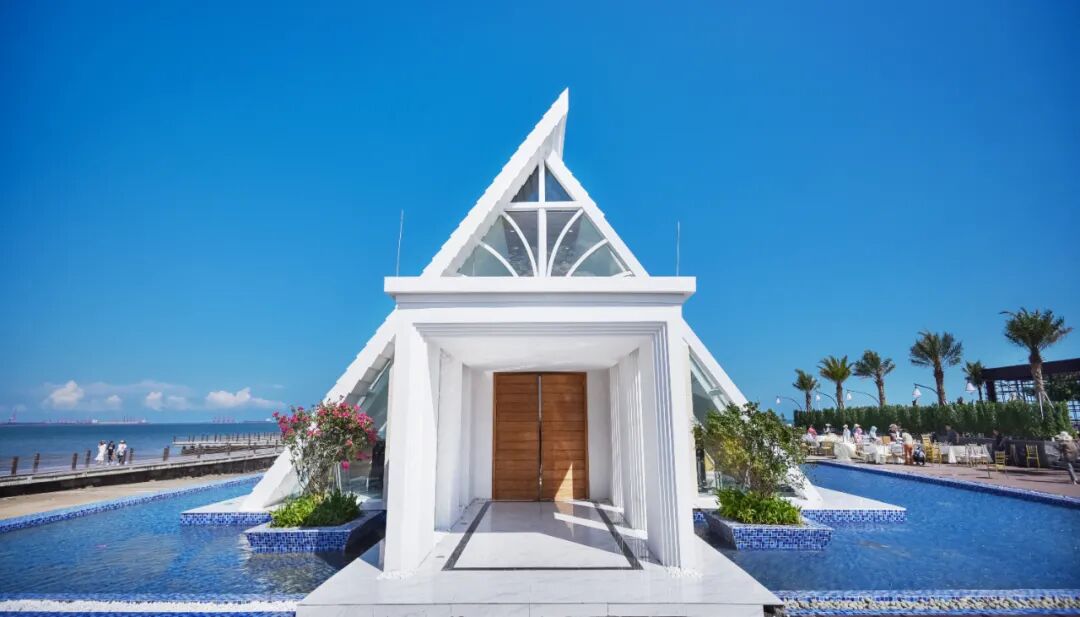 以巴厘岛礼堂建筑理念为核心,简单干练的现代风格为主调,并巧妙引入自然光线,打造通透明亮的婚礼堂。